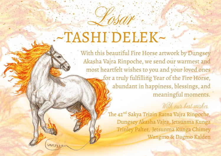 “It is with profound joy that we share the beautiful drawing above by Dungsey Akasha Vajra Rinpoche for our annual Losar greeting card. In past years, Dagmo Kalden had kindly offered the Losar illustrations; and now at this auspicious time, we rejoice that Dungsey Rinpoche is also sharing his artistic offering with all. As we usher in the auspicious Year of the Fire Horse, our family sends you and your loved ones our prayers and good wishes. May the new year bring an increase of merit and wisdom, excellent health, long life, and the spontaneous fulfillment of all your noble aspirations.”