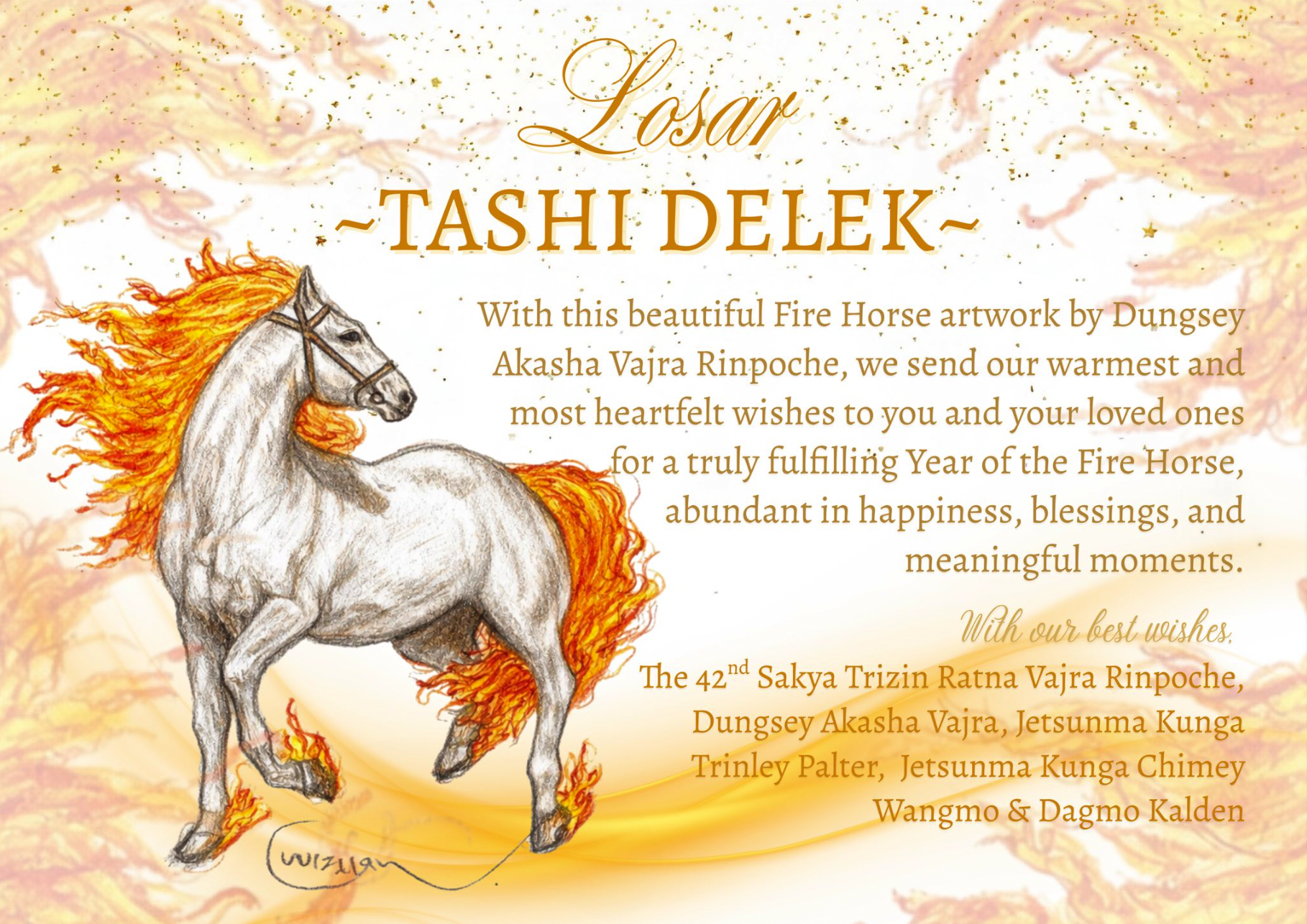 “It is with profound joy that we share the beautiful drawing above by Dungsey Akasha Vajra Rinpoche for our annual Losar greeting card. In past years, Dagmo Kalden had kindly offered the Losar illustrations; and now at this auspicious time, we rejoice that Dungsey Rinpoche is also sharing his artistic offering with all. As we usher in the auspicious Year of the Fire Horse, our family sends you and your loved ones our prayers and good wishes. May the new year bring an increase of merit and wisdom, excellent health, long life, and the spontaneous fulfillment of all your noble aspirations.”